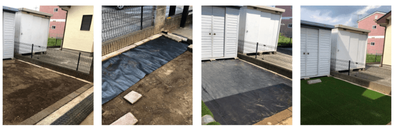 - 防草シートを敷設し、隙間ができないように重ねます。
