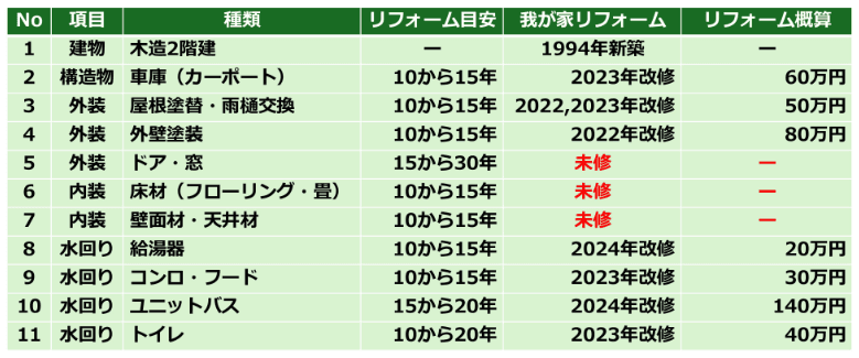 最近のリフォーム総額は概算で420万円(2022-2024年)です。今回含め家電の買替総額は132万円(2018-2025年)です。住まいへの投資は総額552万円に達しました。