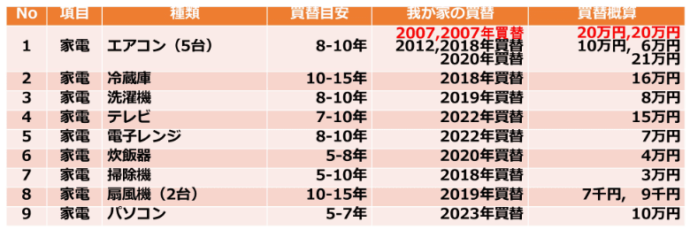 我が家にはエアコンが5台あり、2025年4月には老朽化した2台を買い替えました。これまでのリフォームと買い替えを振り返ると、ここ3年間でカーポート、屋根の塗り替え・雨樋の交換、外壁塗装、給湯器、コンロ・フード、ユニットバス、トイレといった大物をほぼ完了しました。現在、外装のドア・窓、内装の床・壁・天井を残すのみとなっています。また、エアコン以外の家電の買替もひと通りが済み、今回はエアコン買替が中心となりました。