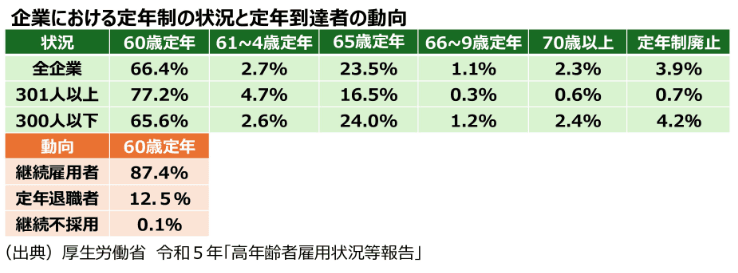 定年制の現状について見てみると、60歳定年が66.4%、65歳定年が23.5%を占め、これら2つを合わせると全体の89.9%に達しています。また、厚生労働省のデータによれば、60歳定年を迎えた人のうち87.4%が、その後も同じ会社での継続雇用を希望していることが確認されています。